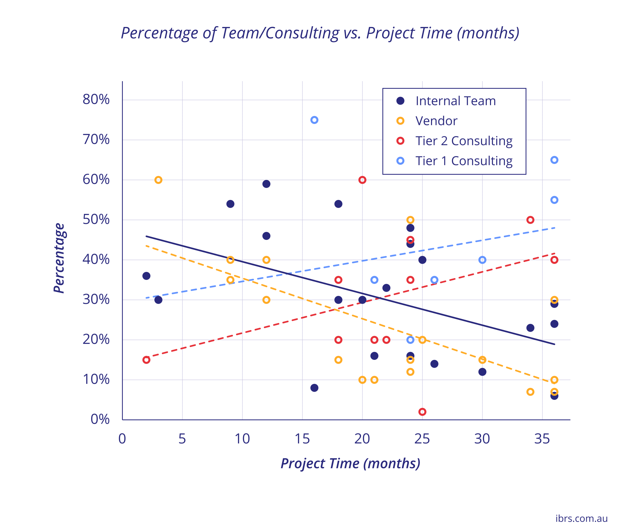 This chart provides datapoints of projects reviewed in this study. The points represent the intersection of the length of project time to implement a new core platform versus how much of the project (in terms of human resourcing) a specific category of consulting firm played. For example, the vendor point at the 60 % and 3 month market was a project where a vendor was a major player in an ERP uplift, and represents a compelling example of heavy reliance on a vendor partner. Conversely, the tier 1 vendor points at 65 % and 55 % involvement at more than 35 months of project time show examples of where heavy use of tier 1 consultancies saw extremely long timelines.