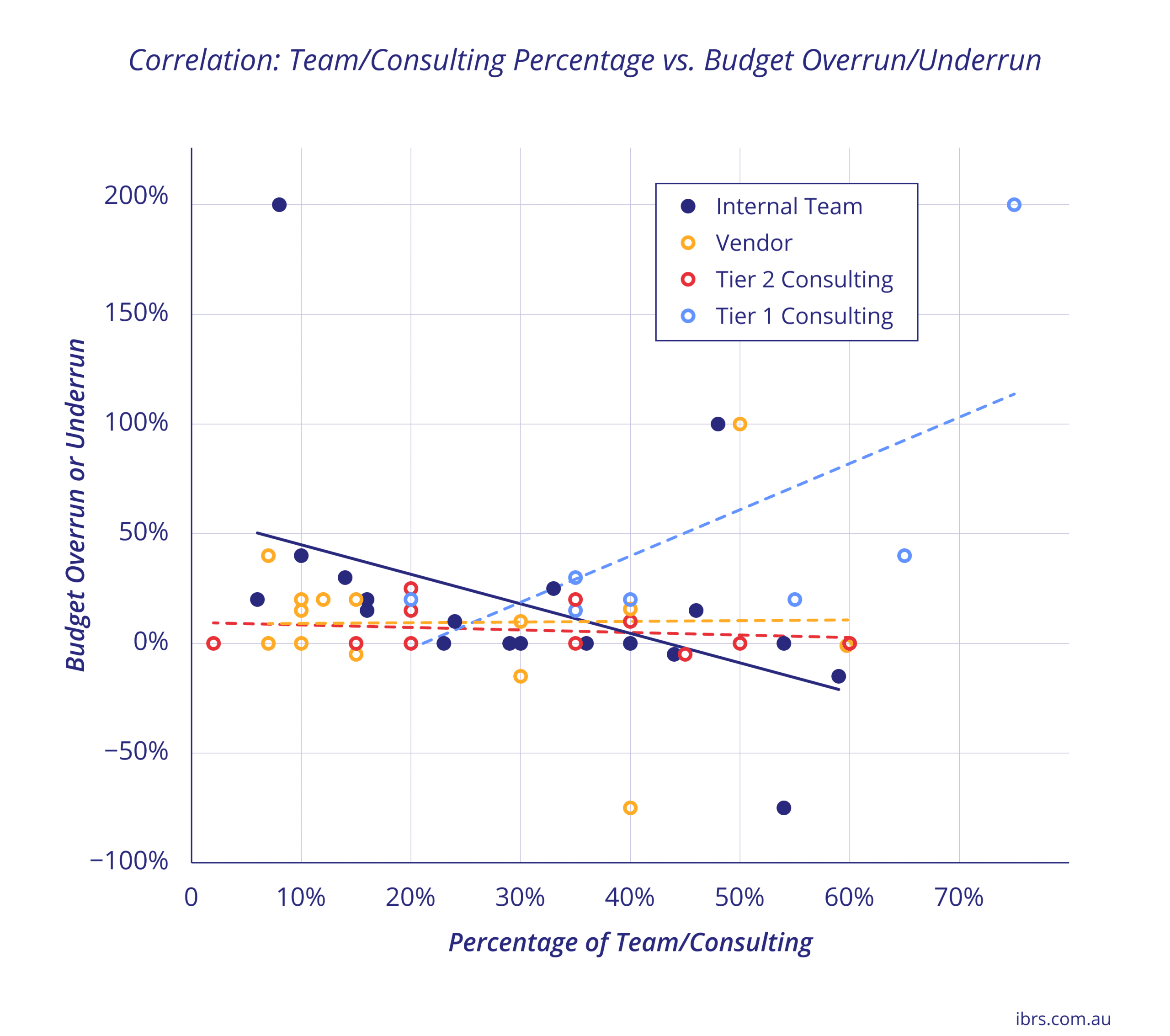 What the Data Shows Us: IBRS analysis reveals a counter-intuitive correlation: projects with heavy reliance on tier 1 consulting firms for strategy and management were statistically more likely to experience budget overruns and extended timelines. Conversely, projects led by strong internal teams, supported by vendors and niche tier 2 consultancies, correlated strongly with shorter delivery times and adherence to budget.