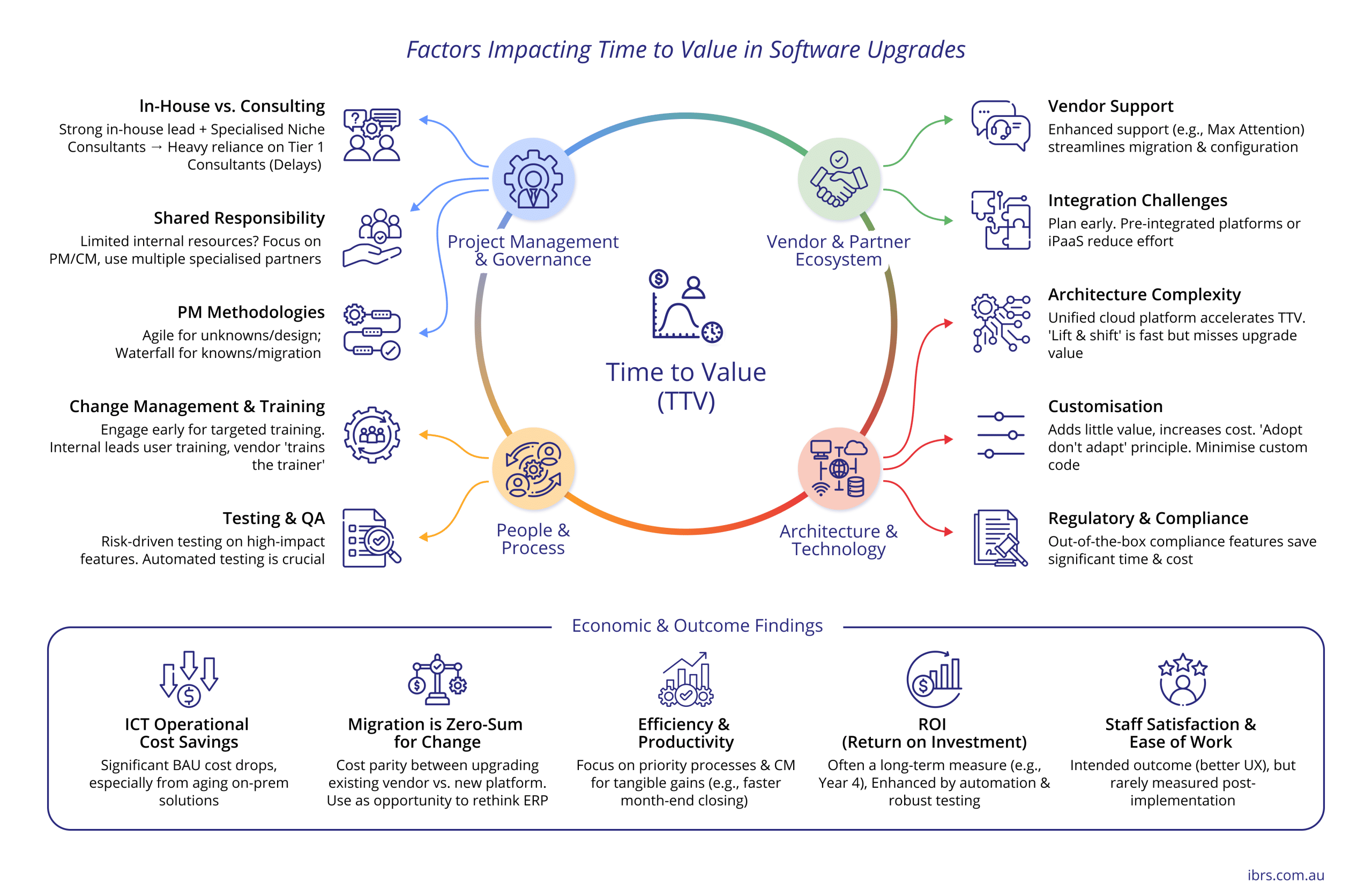 The level of support from the product vendor, such as SAP’s Max Attention program and TechnologyOne’s SaaS Plus, influences the timeline of the upgrade process. Enhanced vendor support in specific areas, specifically data migration and configuration, streamlines governance and quality assurance, thereby reducing the time required for upgrades. However, this needs to be balanced with internal project management capabilities (see Fact 1).