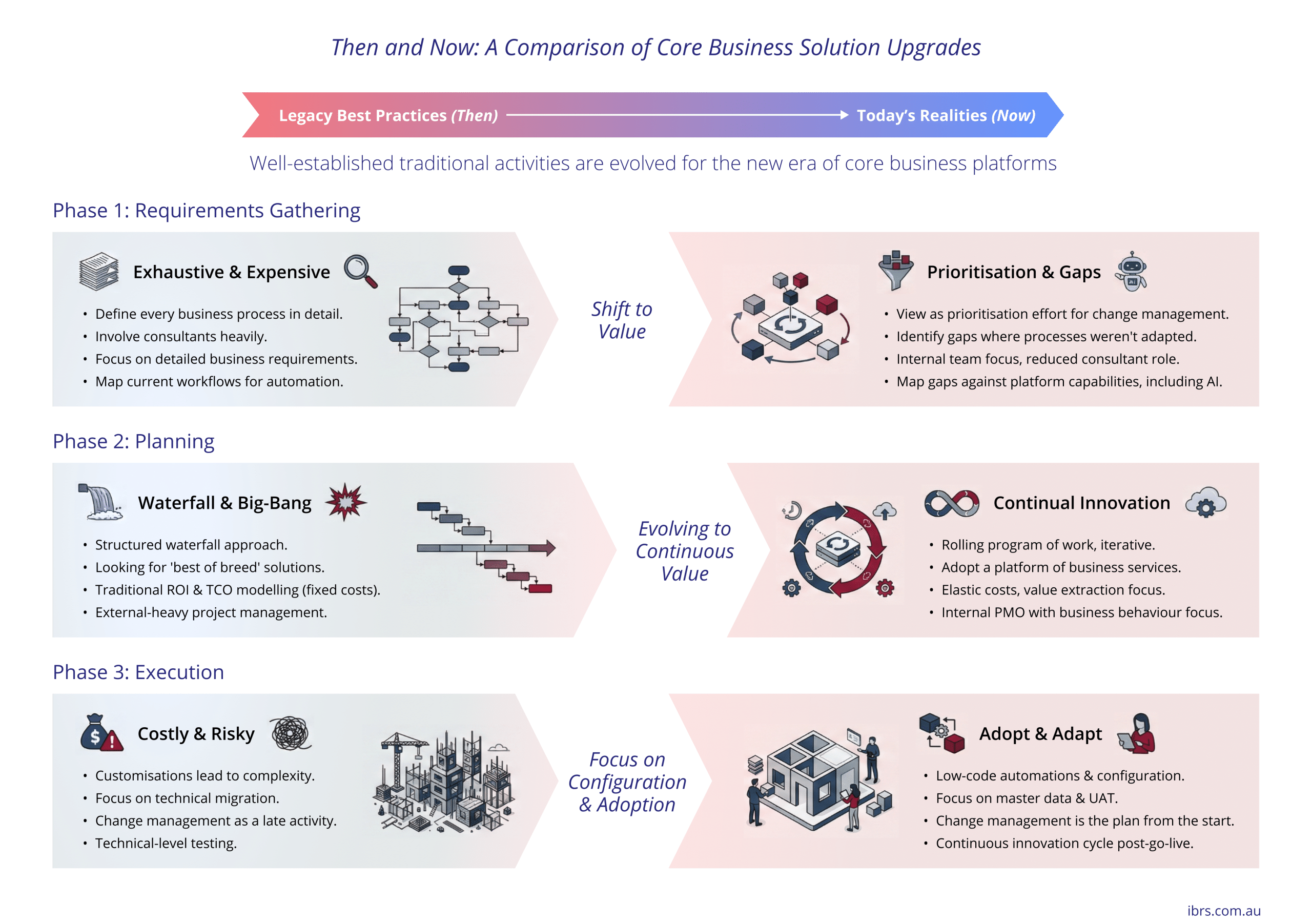 There is a substantial body of literature relating to managing large core business solution projects, most of which conform to well-established best practices regarding requirements gathering, project methodologies, constraining customisation, integration, and so forth. All of these ‘truisms’ have stood the test of time.