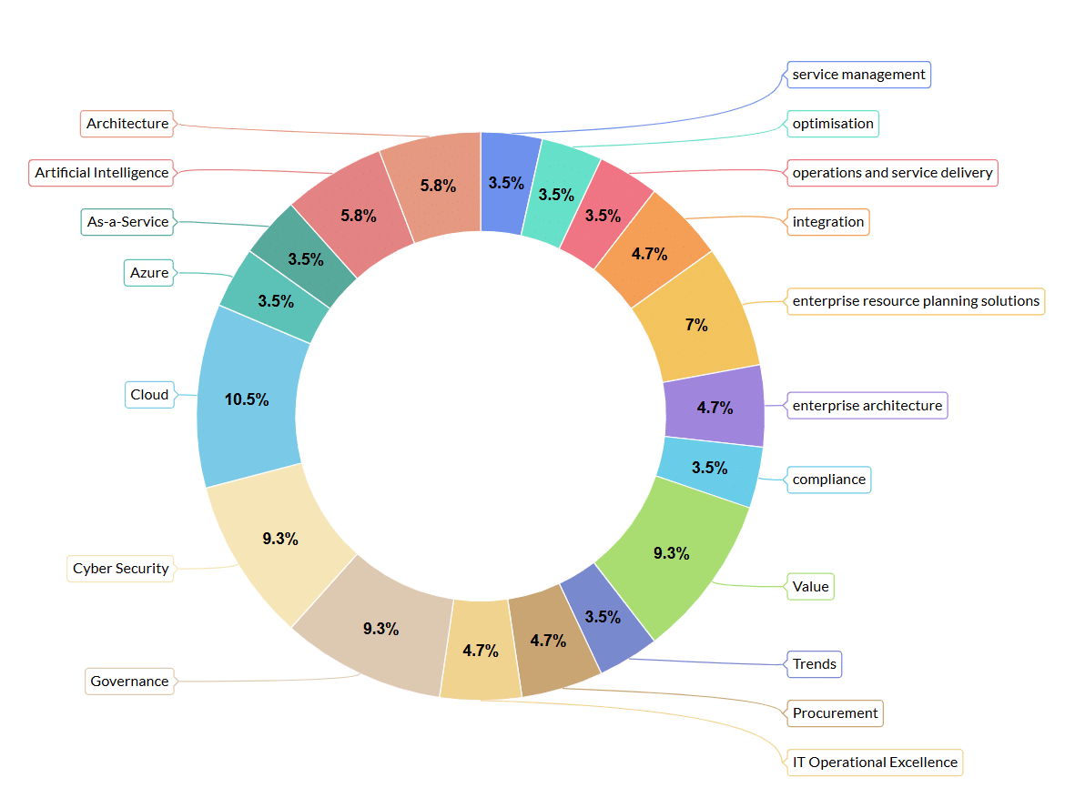 Leading topics include cloud, cyber security, governance, and value extractions, reflecting organisations’ efforts to optimise operations and manage risk amidst evolving digital landscapes.