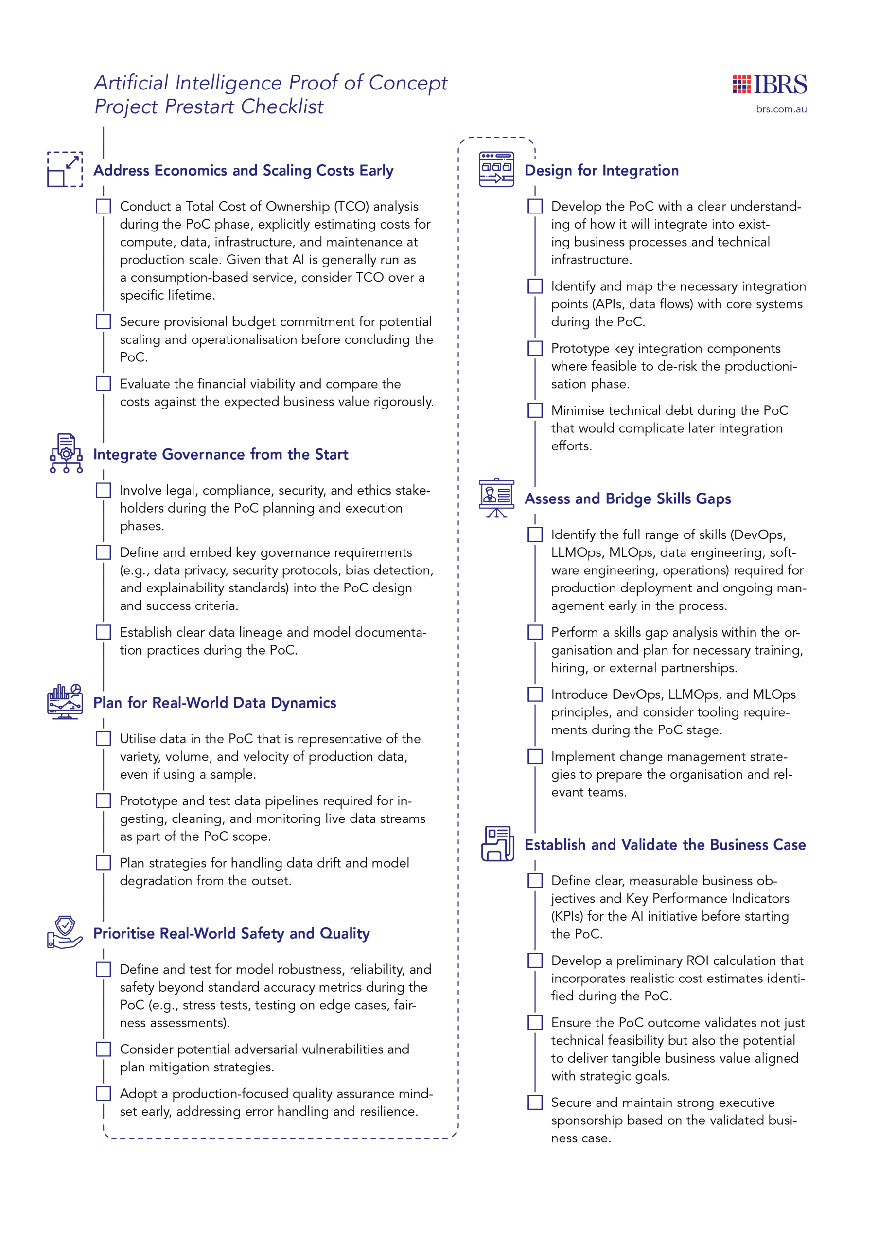- Before moving forward with an AI PoC, work through the IBRS Artificial Intelligence Proof of Concept Project Prestart Checklist to validate that the PoC has the potential to deliver real business value and to avoid any future roadblocks to its production.
