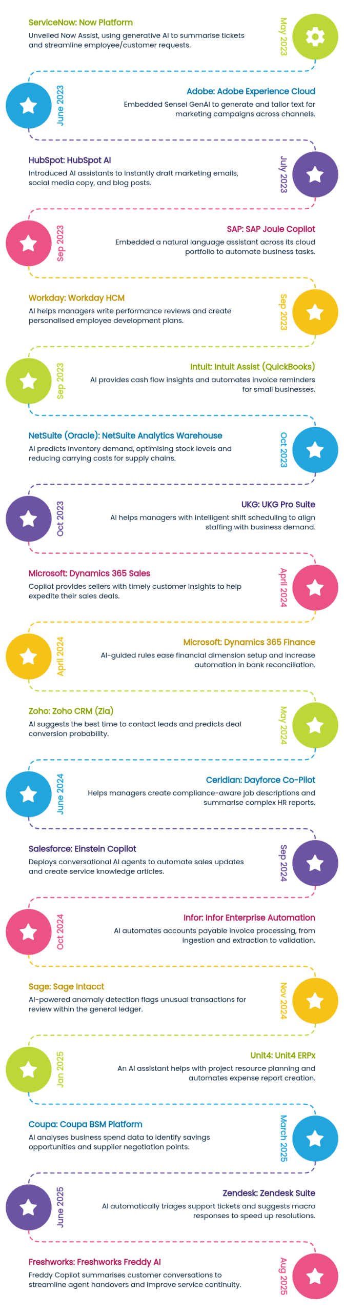 | October 2023 | NetSuite (Oracle) | NetSuite Analytics Warehouse: AI predicts inventory demand, optimising stock levels and reducing carrying costs for supply chains. |
